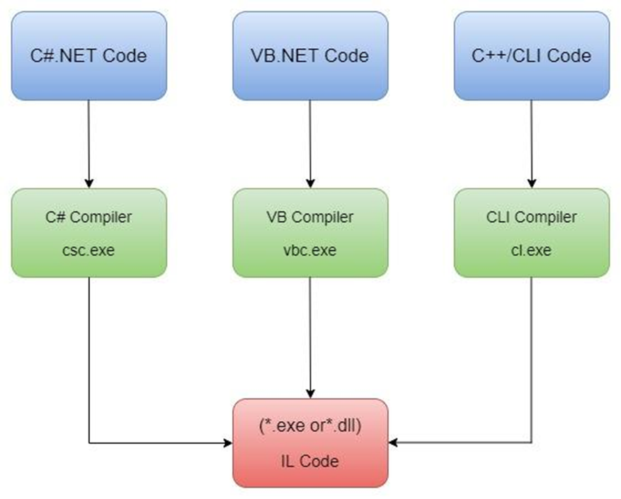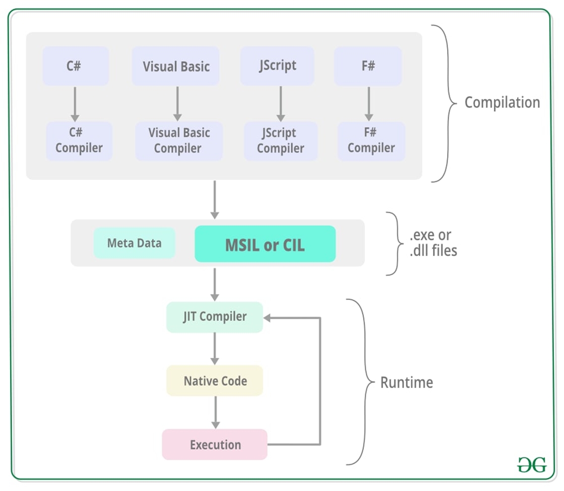 Dasturni ishlab chiqish jarayonida .Net platformasi turli dasurlash tillari(C#, F#,Visual basic) uchun har birida alohida kompilyatorlardan foydalanadi. Biz yozgan kodimiz kompilyatsiya jarayonidan keyin, har bir .Net kompilyatori kodimizni intermediate code (o’rta kod) ga o’girib beradi, va har bir muhit bunda MSIL dan foydalanadi.