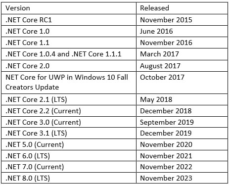 Quyidagi jadvalda zamonaviy .NET ning asosiy versiyalari qachon chiqarilgani, kelajakdagi relizlar qachon rejalashtirilganligi ko‘rsatilgan:
