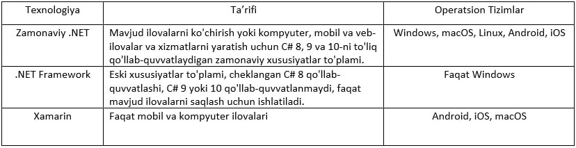 • .NET Core: Kross-platforma va yangi ilovalar uchun • .NET Framework: Eski ilovalar uchun • Xamarin: Mobil ilovalar uchun