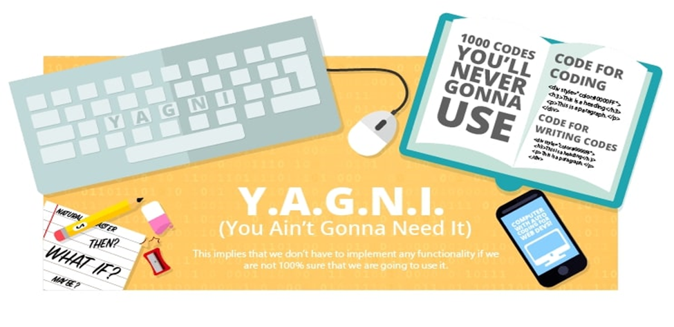 Y.A.G.N.I ham boshqa loyihalash tamoyillari singari qisqartma so’z bo’lib, “You aren’t gonna need it” – “Sizga kerak bo’lmaydi” tarzida tarjima qilishimiz mumkin. Bu kelajakda bizning dasturiy ta’minotimizga kerak bo’ladigan qobiliyatlar hozir yaratilmasligi kerak ekanligini anglatadi. Har doim narsalarni sizga kerak bo’lgandagina amalga oshiring, hech qachon menga kelajakda kerak bo’lib qolishi mumkin degan o’y bilan davom etmang.