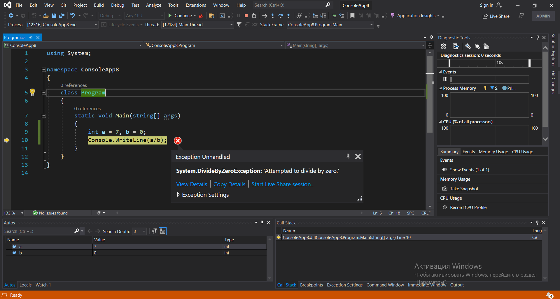 Yuqoridagi rasmda 7 ni 0 ga bo'lishga urinish tufayli System.DivideByZeroException xatoligi yuzaga kelgan.