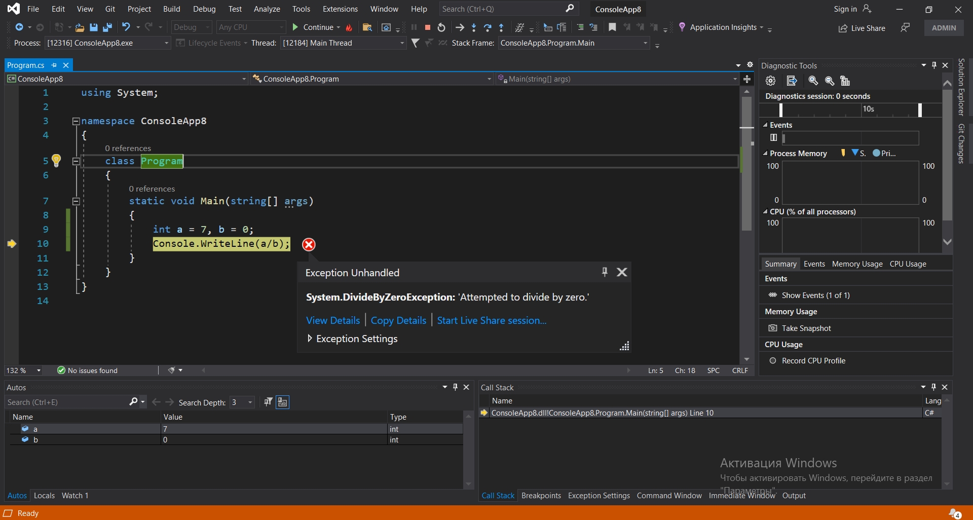 Yuqoridagi rasmda 7 ni 0 ga bo'lishga urinish tufayli System.DivideByZeroException