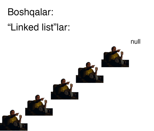 LinkedList – ikki tomonlama bog'langan, ulangan to'plam. Ya'ni to'plamning har bir elementi o'zidan bitta oldingi va bitta keying elementning LINK ini saqlaydi. Huddi bular kabi: ⬇️