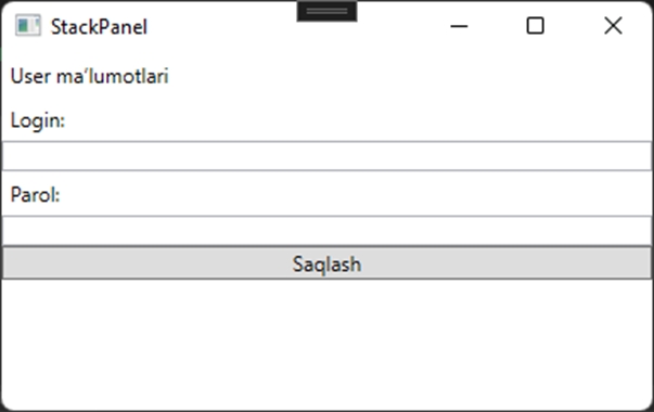 Oddiy holda StackPanel ichidagi elementlarni tepadan pasga qarab joylashtiradi. Yuqoridagi misolda ko’rishimiz mumkunki, StackPanel elementlarni bo’yini minimum berib tepadan pasga qarab joylashtirgan, elementlarni eniga bo’lsa o’zini to’ldirguncha cho’zgan.