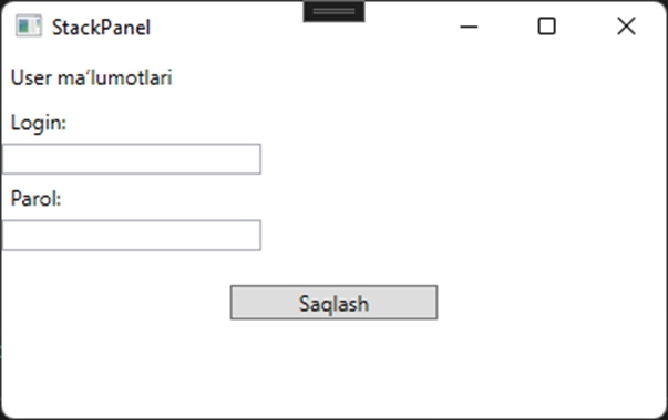 StackPanel - eng oddiy konpanovka konteynerlaridan biri. U bolalarini(children) bitta ustun yoki bitta qator qilib joylashtiradi. Misol uchun, quyidagi oynani ko‘ramiz: