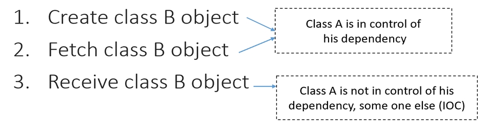 Bu holatda esa B Classdan Objectni qabul qilib oladi. Endi bu vaziyatda A Class B Class ga qaram bo’lmaydi, endi buni holatini (IoC) boshqaradi ya’ni dependency IoC ga bog’liq bo’ldi.