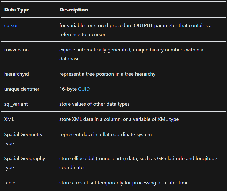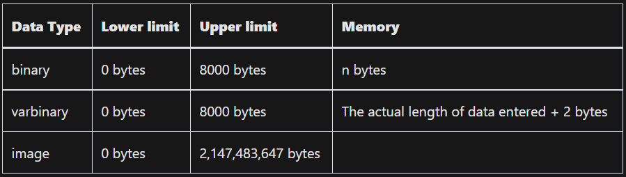 binary [ ( n ) ] n bayt boʻlgan qattiq uzunlikdagi ikkilik maʼlumotlar , bu yerda n 1 dan 8000 gacha boʻlgan qiymatdir. Saqlash hajmi n bayt. varbinary [ ( n | max ) ] Oʻzgaruvchan uzunlikdagi ikkilik maʼlumotlar. n 1 dan 8000 gacha bo'lgan qiymat bo'lishi mumkin. max maksimal saqlash hajmi 2^31-1 bayt ekanligini ko'rsatadi. Saqlash hajmi - kiritilgan ma'lumotlarning haqiqiy uzunligi + 2 bayt. Kiritilgan ma'lumotlar uzunligi 0 bayt bo'lishi mumkin. image - 0 dan 2^31-1 (2,147,483,647) baytgacha bo'lgan o'zgaruvchan uzunlikdagi ikkilik ma'lumotlar.