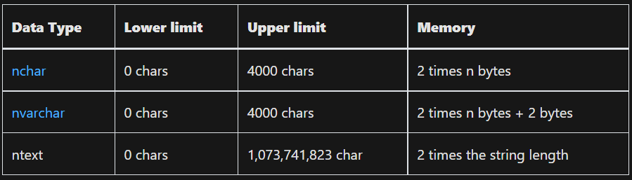 Bu typedagilar (nchar, nvarchar, ntext) saqlashda Unicode tarzda saqlaydi.1ta belgi uchun 2 bayt ajratadi. Belgilar boshidagi n harfi "National" ma'nosini beradi. Asosan boshqa tillar(japan, korea..)dagi belgilarni ham saqlaydi. Shuning uchun 2 baytdan ajratadi. Xotirada ham 2n oladi. Agar sizda bir nechta tillarni qo'llab-quvvatlaydigan saytlar bo'lsa ushbu type lardan foydalanganingiz yaxshi.