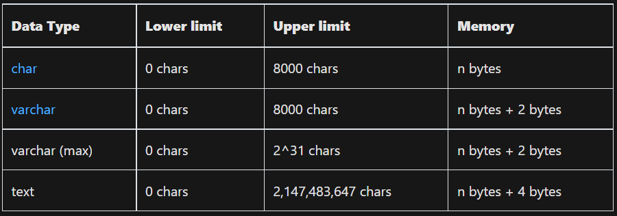 CHAR - max uzunligi 1 dan 8000 baytgacha. E'lon qilinishi char(n). Default 1. Agar belgilangan o'lchamdan kam ma'lumot kiritilsa SQL unga bo'sh [" "] qo'shadi. So'raganingizda qaytarishdan oldin ularni olib tashlaydi. Uzun bo'lsa xato beradi.