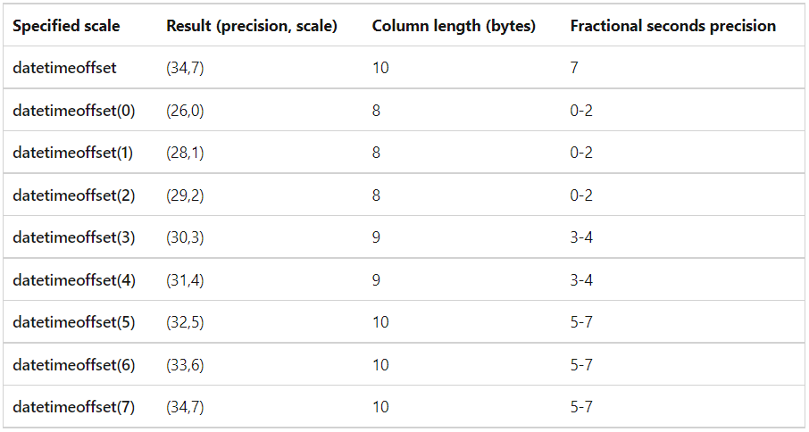 datetimeoffset - Datetime2 kabi 24 soatlik soat asosida kunning vaqti bilan birlashtirilgan sanani belgilaydi va UTC (Umumjahon vaqt koordinatasi yoki Grinvich vaqti) asosida vaqt mintaqasi xabardorligini qo'shadi. Standart string YYYY-MM-DD hs:dd:ss[.nnnnnnn] [{+|-}ss:mm]. 26 belgidan max 34 tagacha.