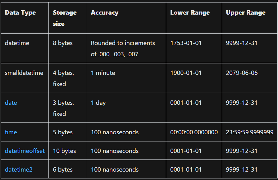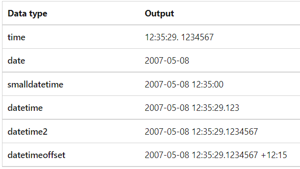 Yangi ishlaringizda time, date, datetime2 va datetimeoffset maʼlumotlar turlaridan foydalaning. Ushbu turlar SQL standartiga mos keladi. Ular ko'proq portativdir. time , datetime2 va datetimeoffset ko'proq soniya aniqligini ta'minlaydi. datetimeoffset global o'rnatilgan ilovalar uchun vaqt mintaqasini qo'llab-quvvatlaydi.