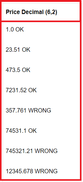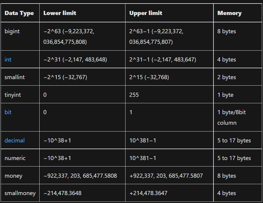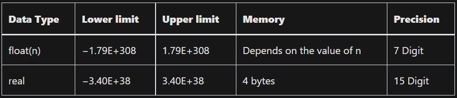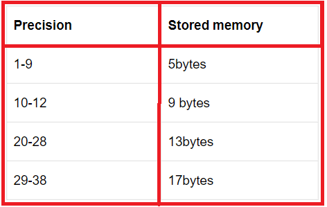 decimal va numeric funksional bir xil (p[,s]) da ishlaydi. Precision(Aniqlik) va Scale(Masshtab). P - saqlanishi kerak bo'lgan o'nlik raqamlar soni, 1 dan 38 gacha, default 18. S - kasrning o'ng tomonida saqlanadigan raqamlar soni. 0 <= s <= p. default 0.