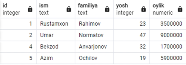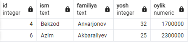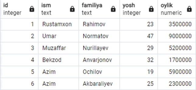 Jadvaldagi familiyasi "ov" bilan tugaydigan xodimlarni olish uchun quyidagi kod yoziladi: