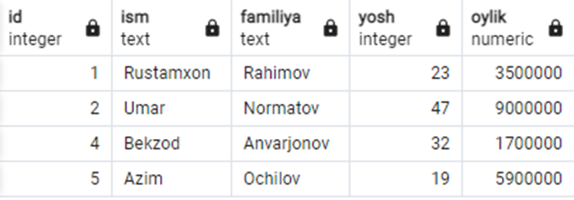 Aytaylik bizda quyidagi jadval bor: