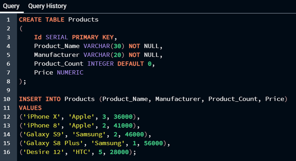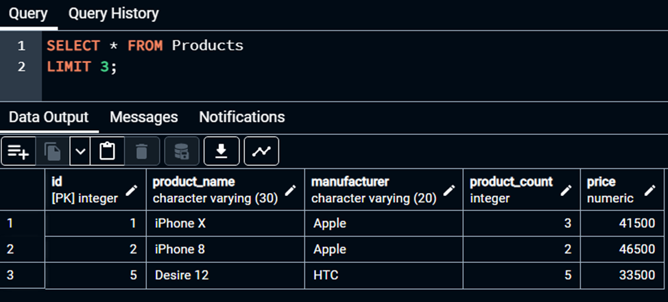 Endi esa LIMIT operatori haqida gaplashamiz. LIMIT bizga biz so‘ragan miqdordagi ma’lumotlarni bizga taqdim qilish uchun ishlatiladi. Deylik, bizda ilgari yaratilgan va ba‘zi ma‘lumotlar bilan to‘ldirilgan Products nomli jadvalimiz bor:
