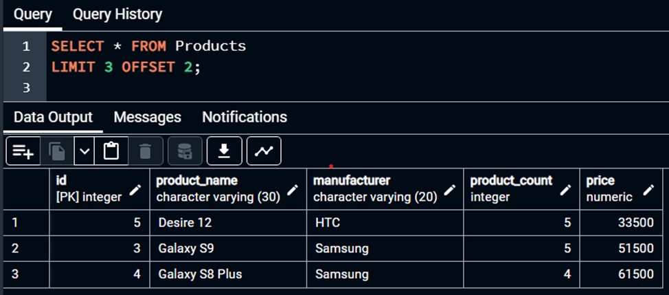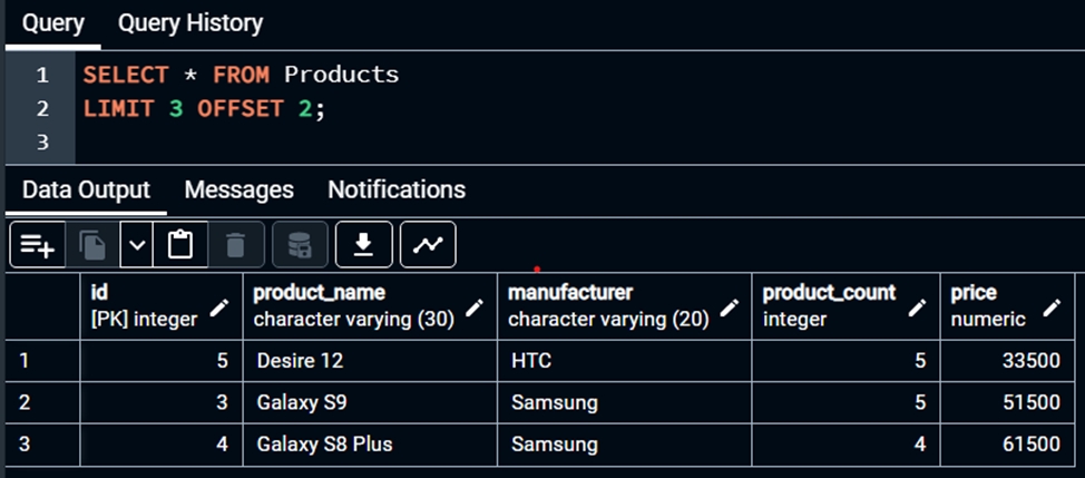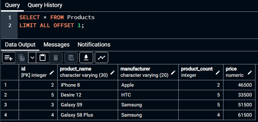 Endi masalaga boshqacha yondashib ko‘rsak. Bizga ro‘yxat boshidan emas aniq bir pozitsiyasidan keyin bir qancha ma’lumotlar kerak bo‘lib qoldi desak. Bu yo‘sinda masalaning yechimi OFFSET operatori hisoblanadi.