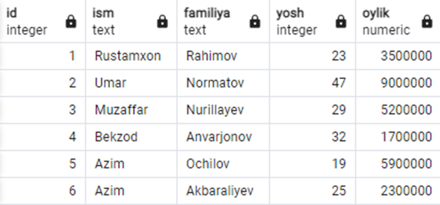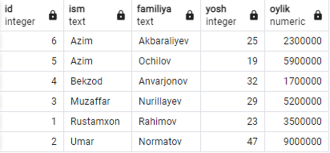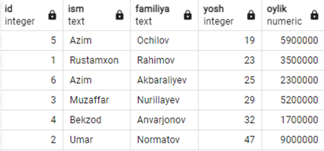 Quyidagi kod esa tepada keltirilgan jadvalni birinchi darajada ismi bo'yicha keyin esa familiyasi bo'yicha saralash kodi: