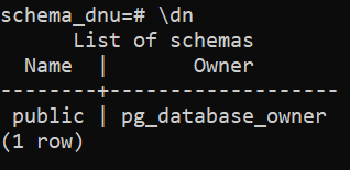 \c schema_dnu;Database'da mavjud bo'lgan schema'larni ko'rish uchun \dn buyrug'idan foydalanamiz.