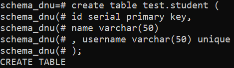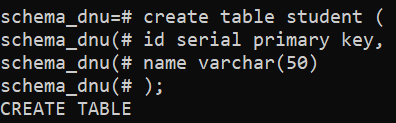 O'zimiz yaratgan schema ichiga jadval yaratish uchun qaysi schemaligini belgilashimiz kerak, belgilamasak public schemasi ichida yaratiladi.