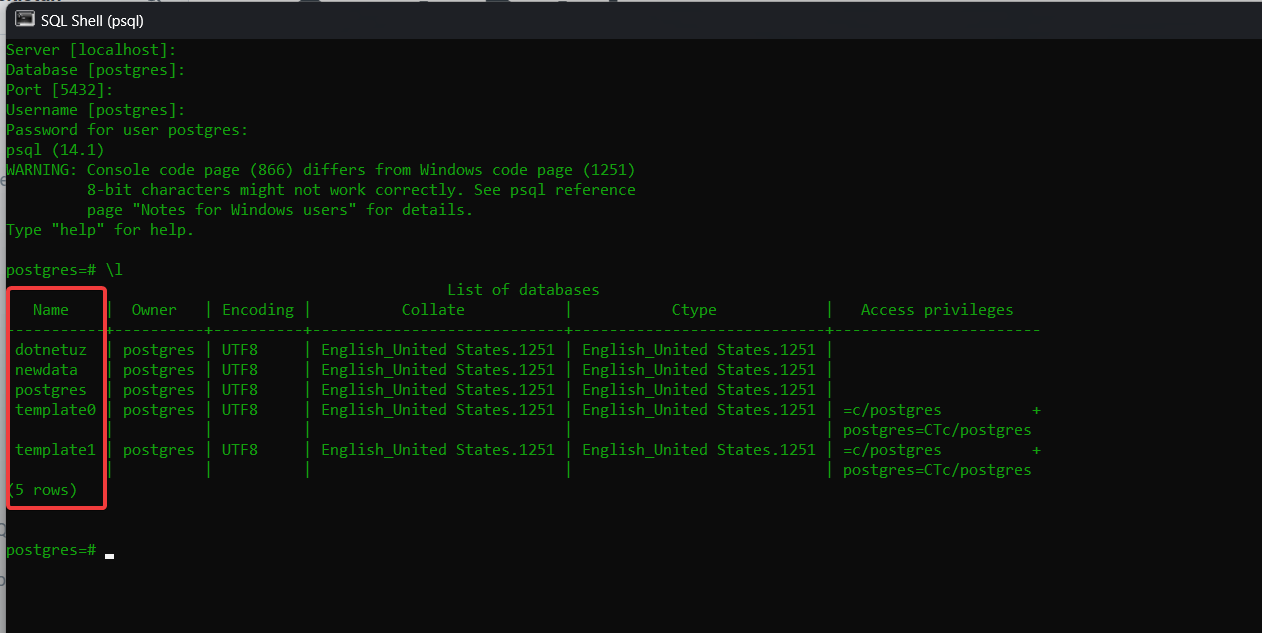 Endi esa ikkinchi yo'l, SQL terminali orqali database'ga ulanishni ko'rib chiqamiz:
