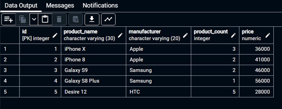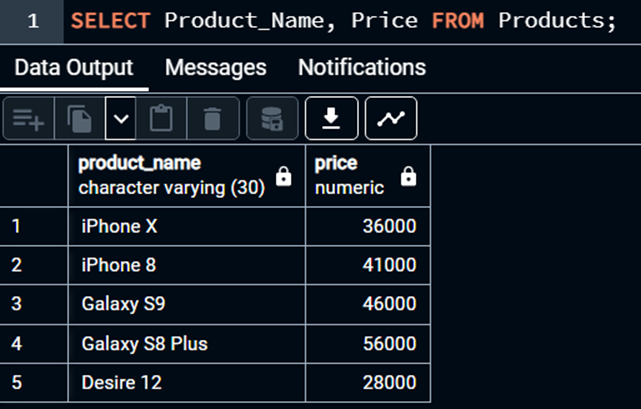 Bu yerdagi “ * ” belgisi, bizga Products jadvalida mavjud bo'lgan barcha ustunlarni (columns) nazarda tutayotganligimizni bildiradi. Natija: