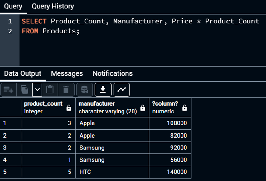 Biz SELECT qabul qilib olayotgan ma'lumotlarga ishlov berib olishning ham imkoni bor. Misol uchun deylik, biz mahsulot adadini (Product_Count), kim tomonidan ishlab chiqilganini (Manufacturer), shuningdek, umimiy mahsulotlar narxini bib olmoqchimiz. Bu quyidagicha ko'rinishga ega: